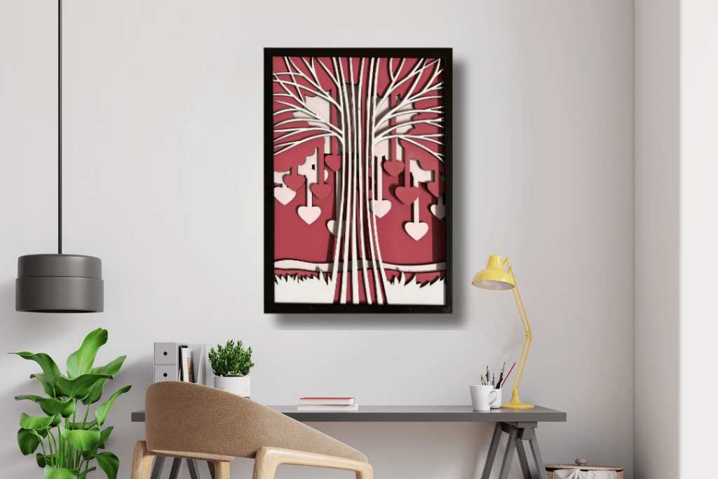 3D Layered Tree of Hearts Wall Art – Handmade Wooden Frame in Pink Romantic Gift for Home Decor