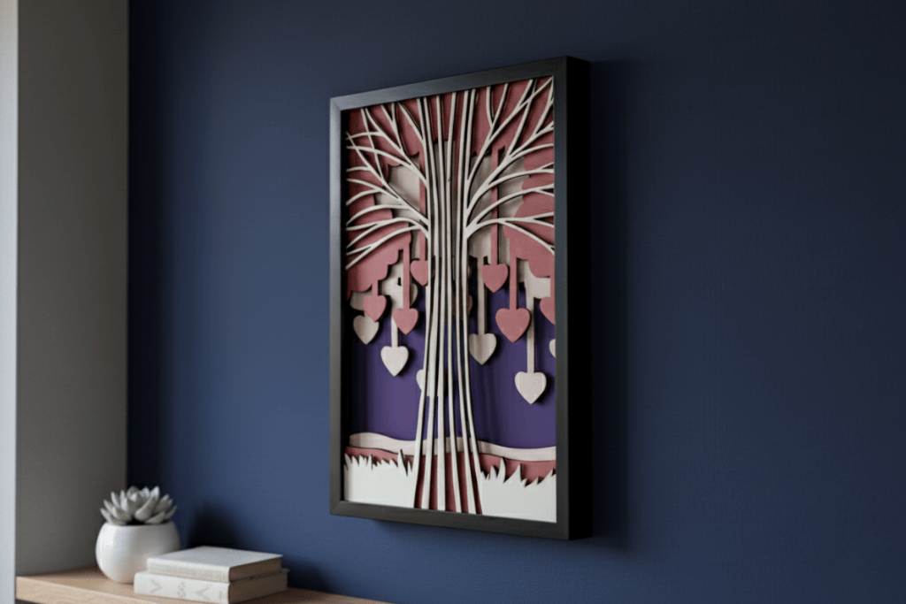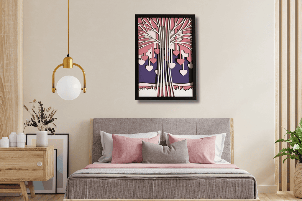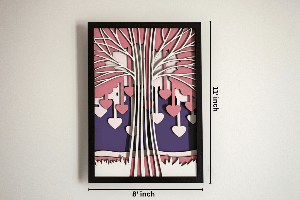 Handcrafted 3D layered wood wall art featuring a Tree of Hearts design in pink or purple. Framed and ready to hang — a perfect romantic gift for weddings, anniversaries, or Valentine’s Day.