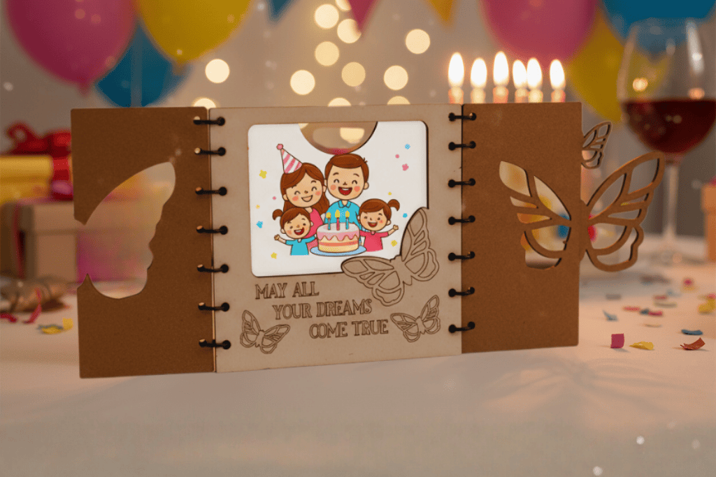 Celebrate birthdays with this handcrafted butterfly birthday card featuring intricate cut-outs, earthy tones, and a heartfelt message. Perfect as a greeting or decorative keepsake