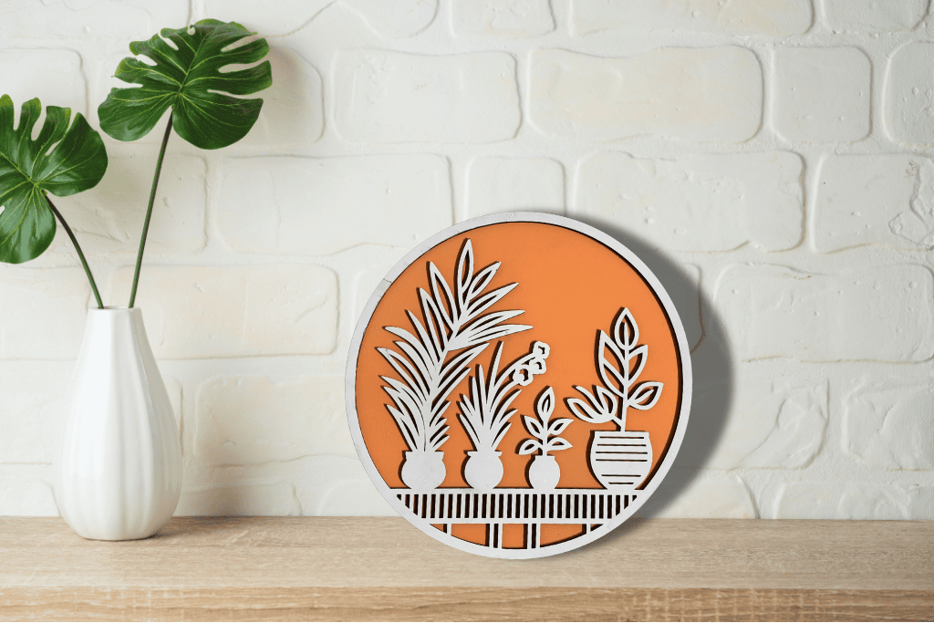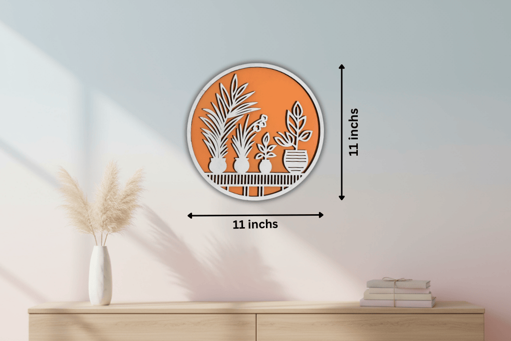 Elevate your space with our Handcrafted Wooden Plant Wall Hanging, designed to blend natural charm with modern aesthetics. Featuring white plant illustrations on a warm orange backdrop, this circular décor piece adds visual warmth and artistic appeal to any room.