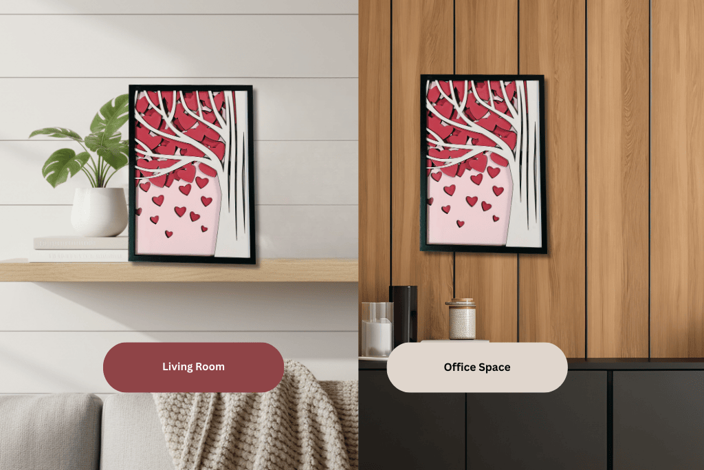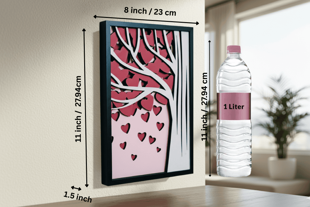 SpecificationDetailsMaterialPremium MDF woodDimensions11″ × 7″ x 1.5″FinishMatte smoothDesignLayered 3D heart treeMountingReady to hangUsageBedroom, living room, or officeOccasionAnniversaries, weddings, Valentine’s DayOriginHandmade in India by CraftsCy