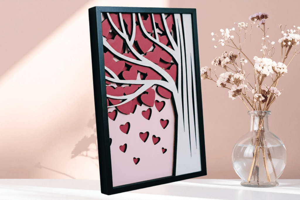 3D heart-tree pattern in a compact 11″ × 8″ x 1.5″ frame